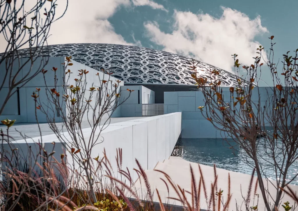 spaces using local materials like date palm waste. The Louvre Abu Dhabi’s vast perforated dome creates a “rain of light” akin to traditional lattices, blending regional heritage with futuristic scale.